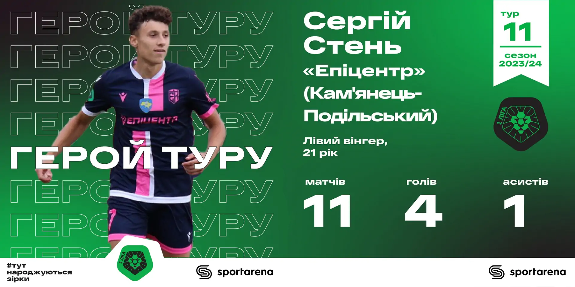 Форвард Епіцентра Сергій Стень у матчі проти Хуста видав, напевно, найкращий свій поєдинок у першоліговій кар’єрі. Нападник здійснив асист і забив два м’ячі, тобто, був причетним до всіх голів своєї команди. Не дивно, що саме Стень став героєм одинадцятого туру Першої ліги.